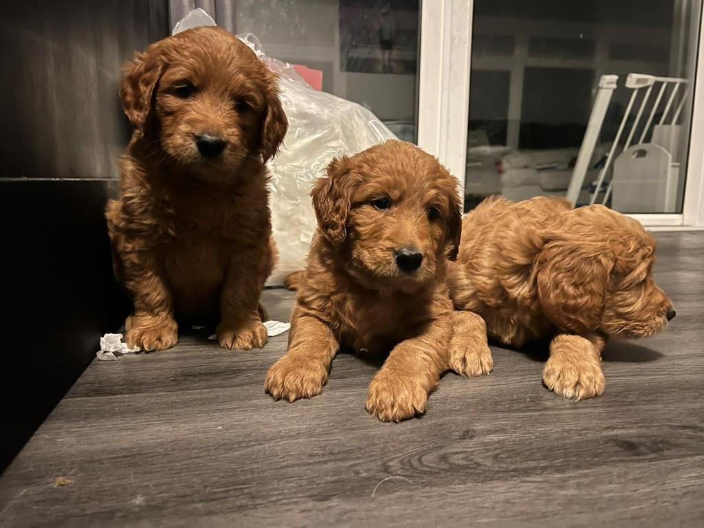 Red Cockerpoo's! Did you know they are also hypoallergenic? They are odorless and require daily brushing to keep their gorgeous coat shiny and smooth.